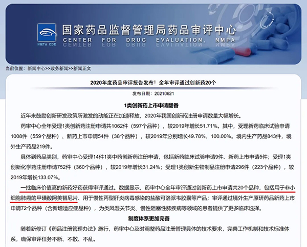 Ameile, included as a "Good New Drug with High Clinical Value" in CDE's Annual Drug Review Report 2020 this time, is China's first original third-generation EGFR-TKI innovative drug independently developed by Hansoh Pharma and approved for marketing in March 2020, and also the world's first third-generation EGFR-TKI with a median progression-free survival (MPFS) exceeding one year (for second-line use)。 It was included in the National Reimbursement Drug List in December 2020. With huge clinical demand and excellent clinical value, Ameile has also been successfully selected into the Reference List of Medical Institutions Providing Some Negotiated Drugs Newly Included in National Reimbursement Drug List 2020 (First Batch), greatly improving the accessibility of domestic innovative drugs.