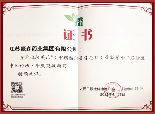 4月28日,人民日报社健康客户端和《健康时报》社颁布了“第十三届健康中国论坛·年度突破新药”等系列榜单荣誉。江苏乐天堂FUN88药业集团有限公司(以下简称“乐天堂FUN88药业”)自主研发的首个中国原创三代EGFR-TKI创新药阿美乐®(甲磺酸阿美替尼片)荣膺上榜。