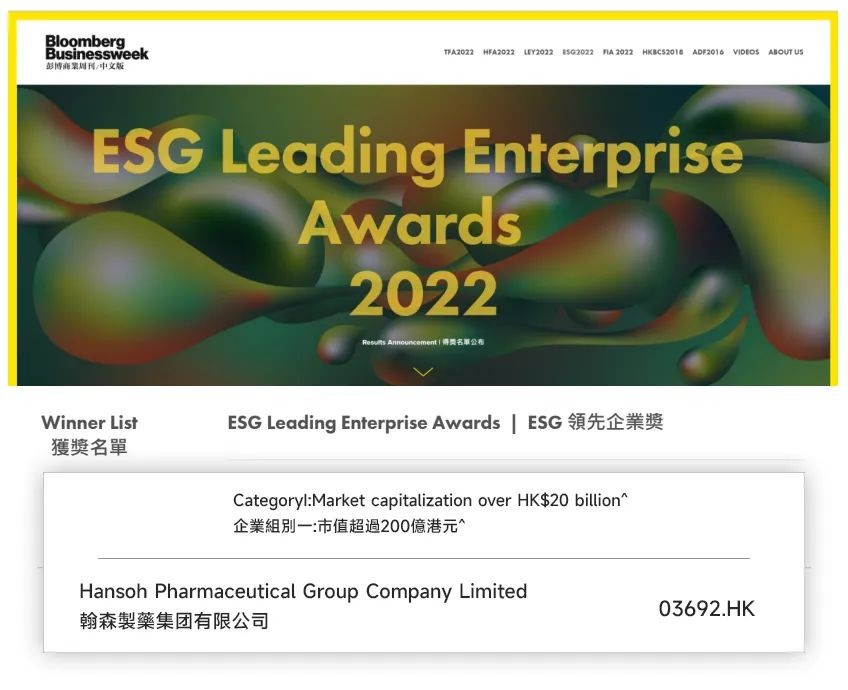 翰森制药获评《彭博商业周刊/中文版》ESG领先企业奖